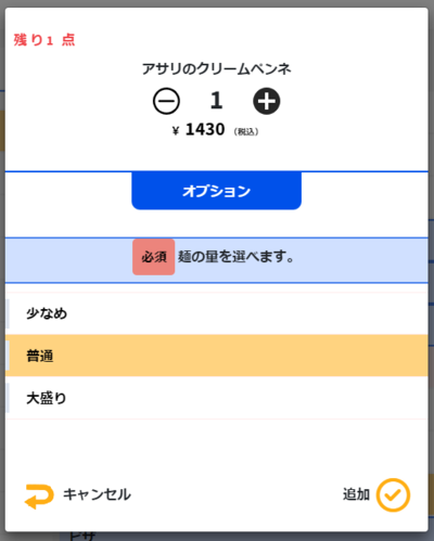 ⑥メニュー画面で対象商品をタッチしたらオプションのポップアップが表示されます。