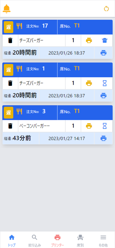 最初に登録された注文は自動的に調理中になります。