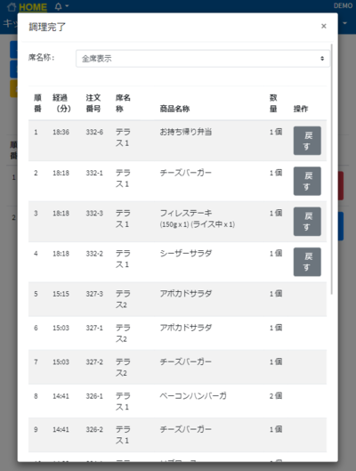 調理完了にした商品が表示されますので戻したい商品の「戻す」を押します。