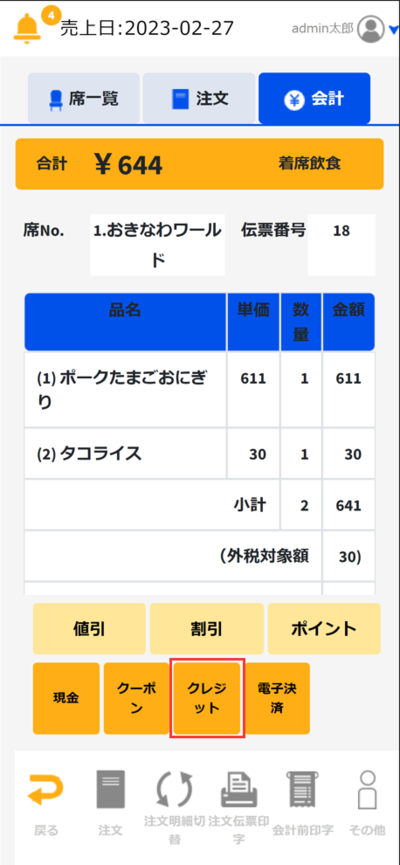 会計画面で「クレジットカード」をタッチします。