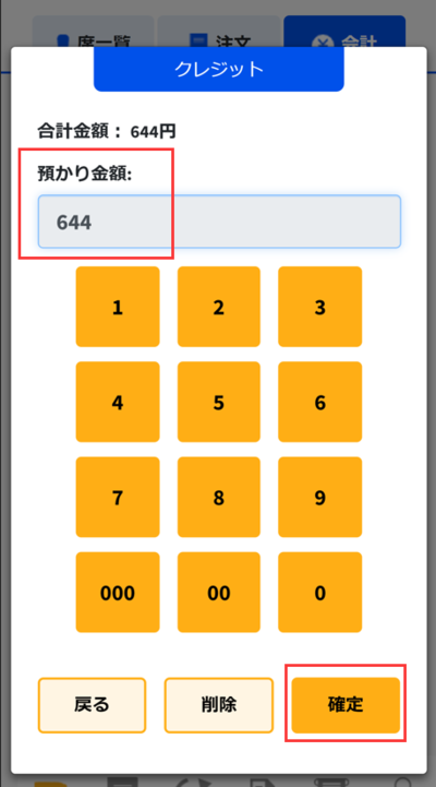 お預かり金額に金額を入力したことを確認して画面右下の「確定」をタッチしてください。