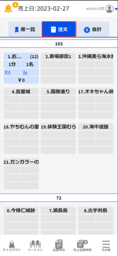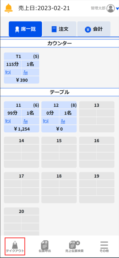 ①「席一覧」タグから「テイクアウト」をタッチします。