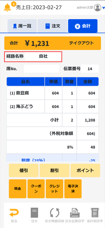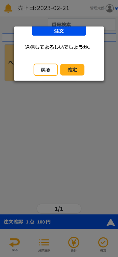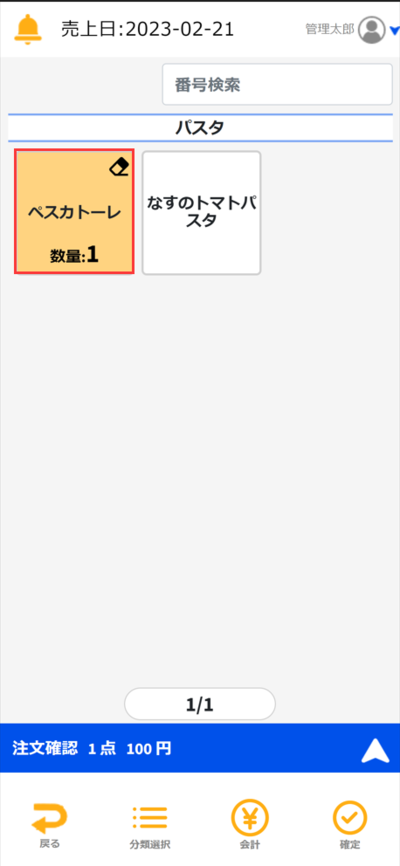 ④注文画面から商品を注文して会計画面に進みます。