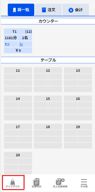 ①「席一覧」タグから「イートイン」をタッチして進みます。