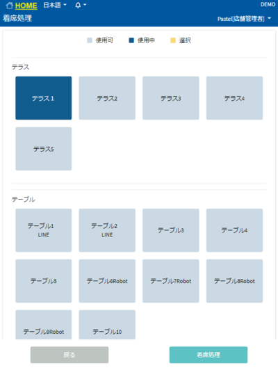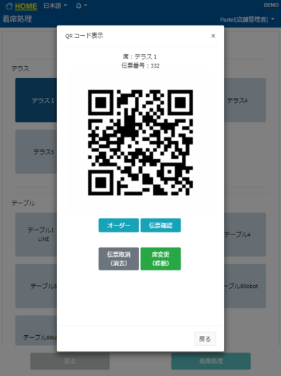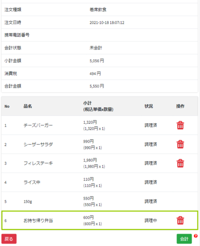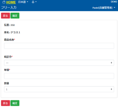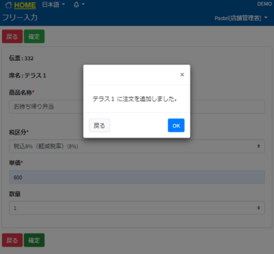 * 着席処理ボタン ①席一覧に入り、フリー商品を追加したい席を選択します。 ②ポップアップが出てくるので「オーダー」を押します。 ③商品情報入力を押します。 ④商品名称、税区分、単価、数量を入力します。 ⑤確定を押すとポップアップが表示されます。 ⑥OKを押すと席一覧に戻ります。 伝票にも追加されています。