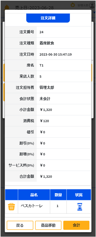 右下の会計ボタンを選択して、会計画面へ進むこともできます。