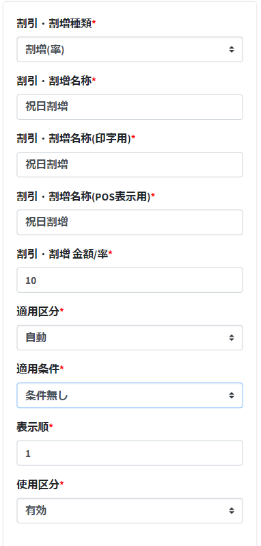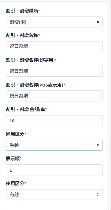 名称と印字用名称がお客様に表示されます。また割引・割増が複数ある場合レシートの下部にまとめて表示される為どんな割引・割増なのか分かる名称に設定して頂くことを推奨します。