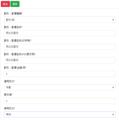 名称と印字用名称がお客様に表示されます。また割引・割増が複数ある場合レシートの下部にまとめて表示される為どんな割引・割増なのか分かる名称に設定して頂くことを推奨します。