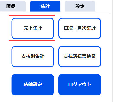 *注意* 売上集計(商品別、時間帯別、分類別、曜日別)は締め処理が完了している売上日のみ見ることが出来ます。