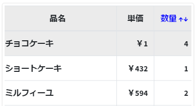 ❸検索をかけますとどの商品が何個売れたかが確認出来ます。 また、赤枠の数量↑↓、金額↑↓を押しますと数量や金額が小さい順、大きい順に並び替えることが出来ます。