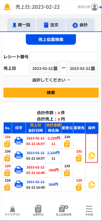 ⑤変更元と変更先が表示されます。削除された売上は赤文字でマイナス表示です。