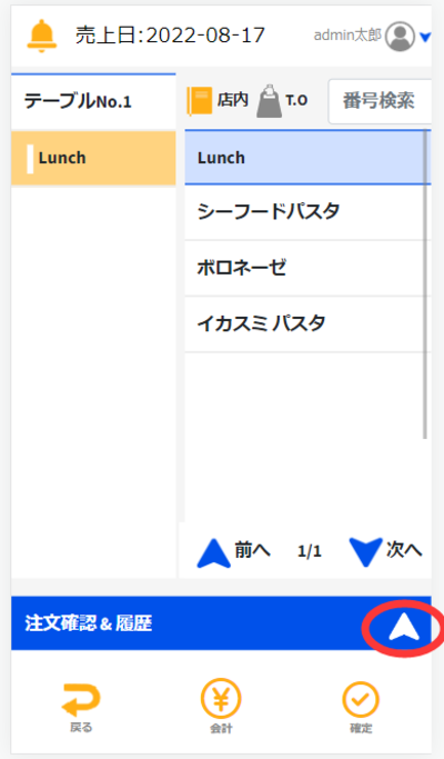 ある商品が注文されている状態で新たに注文商品の個数を減らしたいとき場合にはの場合と同様に「注文」タブが選択されている状態であることを確認して変更したいテーブルを押します。
