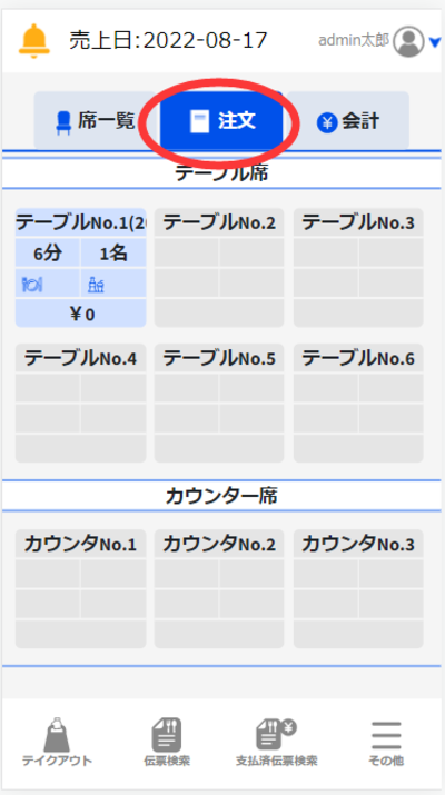 「席処理」の画面において「注文」タブが選択されていることを確認してください。