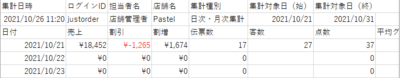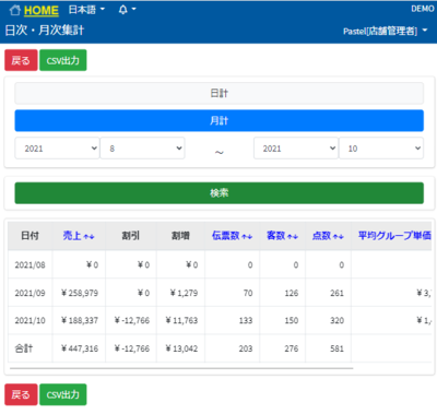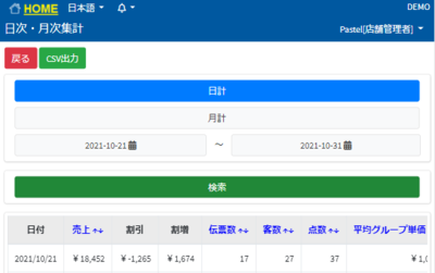 日次売上と月次売上を確認することが出来ます。 日次を選択すると日付を選択出来ます。 月次を選択すると月を選択出来ます。 CSV取り込みを押しますとファイルがダウンロードされます。 文字化けしてしまっているところがあればセルの幅を広げるもしくは文字を小さくすれば治ります。
