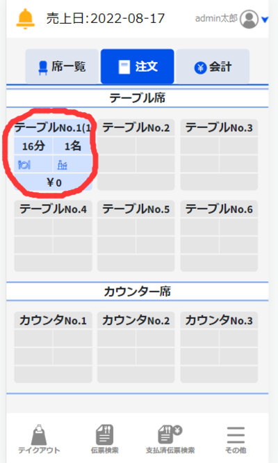 画面に表示されている注文を行いたいテーブルをクリックすると注文画面へと移ることができます。