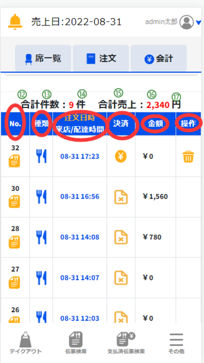 ※「席処理画面」と共通のヘッダーとフッター上のアイコン(通知ボタン、テイクアウト、伝票検索、支払済み伝票検索)の説明は省略します。もし気になられる場合は以下のリンクを参照してみてください。