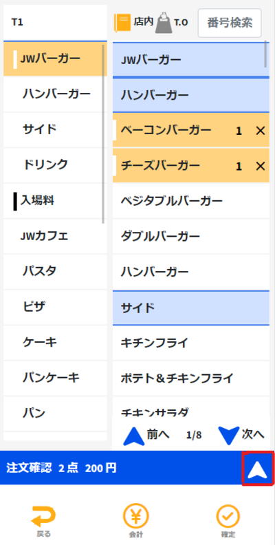 ③すでにある注文の個数を増やしたい場合は、メニュー画面で右下の矢印マークをタッチしてください。