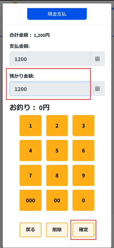 ②お預かり金額に金額を入力したことを確認して画面右下の「確定」をタッチしてください。