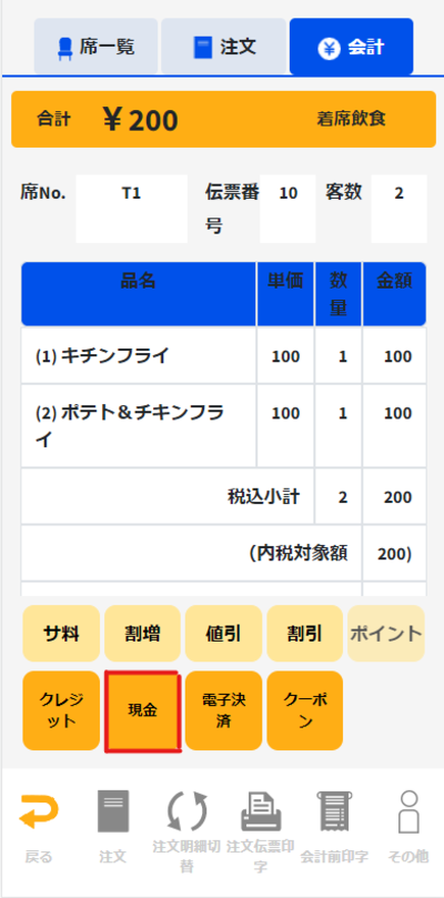 ③支払い金額が上部に表示されますので「現金」タッチします。