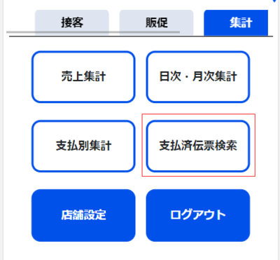 ❶管理画面にある集計タブを選択し支払済伝票検索を選択します。