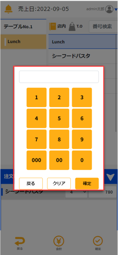 商品の金額を変更したい場合には「注文」タブが選択されている状態であることを確認して変更したいテーブルを押します。