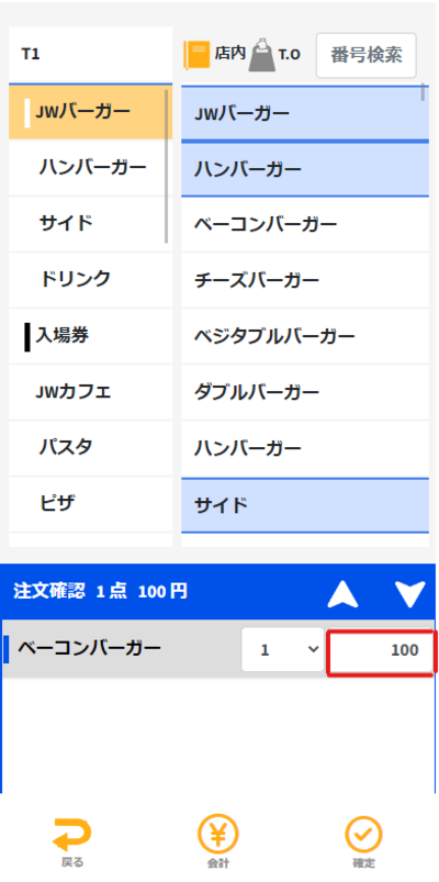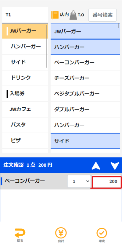 商品の金額を変更したい場合には「注文」タブが選択されている状態であることを確認して変更したいテーブルを押します。「注文画面」が表示されますので下の画像の「上矢印」ボタンをタッチしてください。タッチしていただくと「注文確認&履歴」が表示されます。