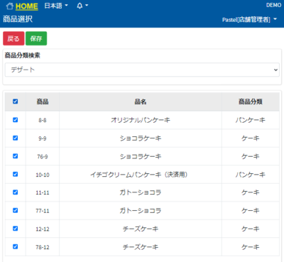 ④商品リスト:「選択」を押し商品一覧に入り食べ放題・飲み放題に付随する商品を選択し保存します。