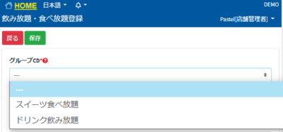 ①グループCD(コード)は事前に商品で登録した商品名称が選択肢に表示されます。