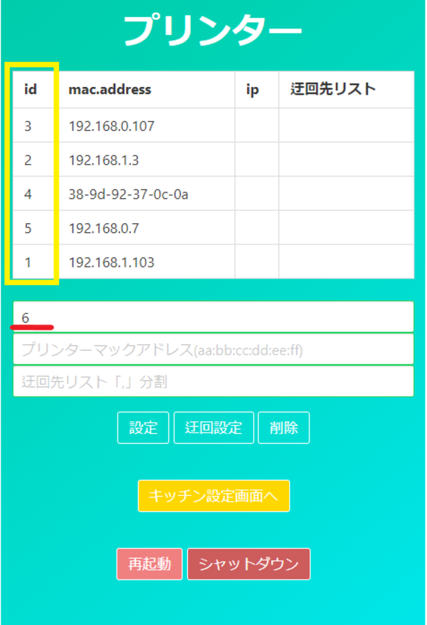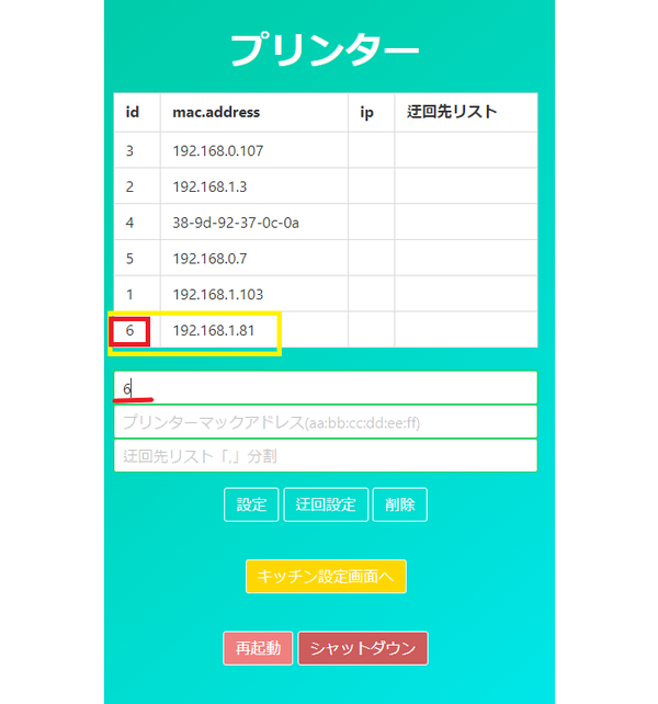 ②ここでは例として「ID:6 IPアドレス:192.168.1.81」が壊れたプリンターという想定で進めます。