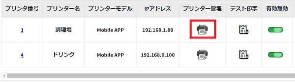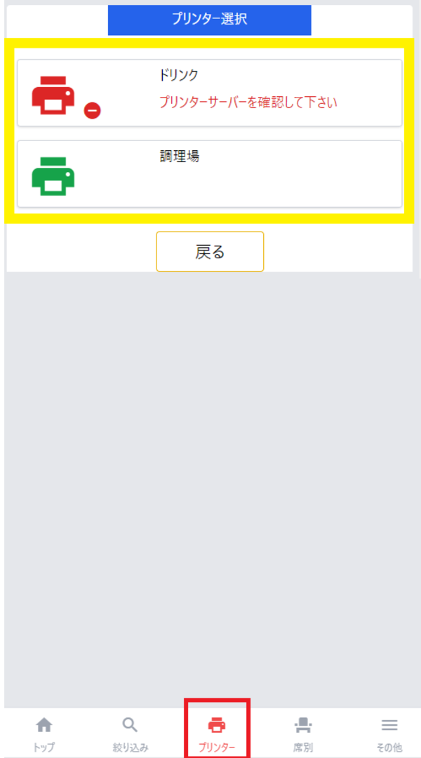 ※この時点で該当プリンターが緑色の場合、「プリンタサーバー管理画面」に移動→「キッチン設定画面へ」をタップし、①プリンターが追加されていること、②緑色になっていることを確認してください。