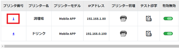 数字はJustOrder内で設定した「プリンタ番号」と連動しています。