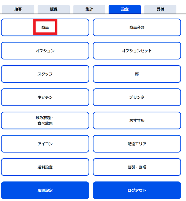 ⑥「店舗管理者」のアカウント(admin)でログインし、「設定」→「店舗管理」をタップしてください(店長アカウントなどには店舗管理の権限がありません)。